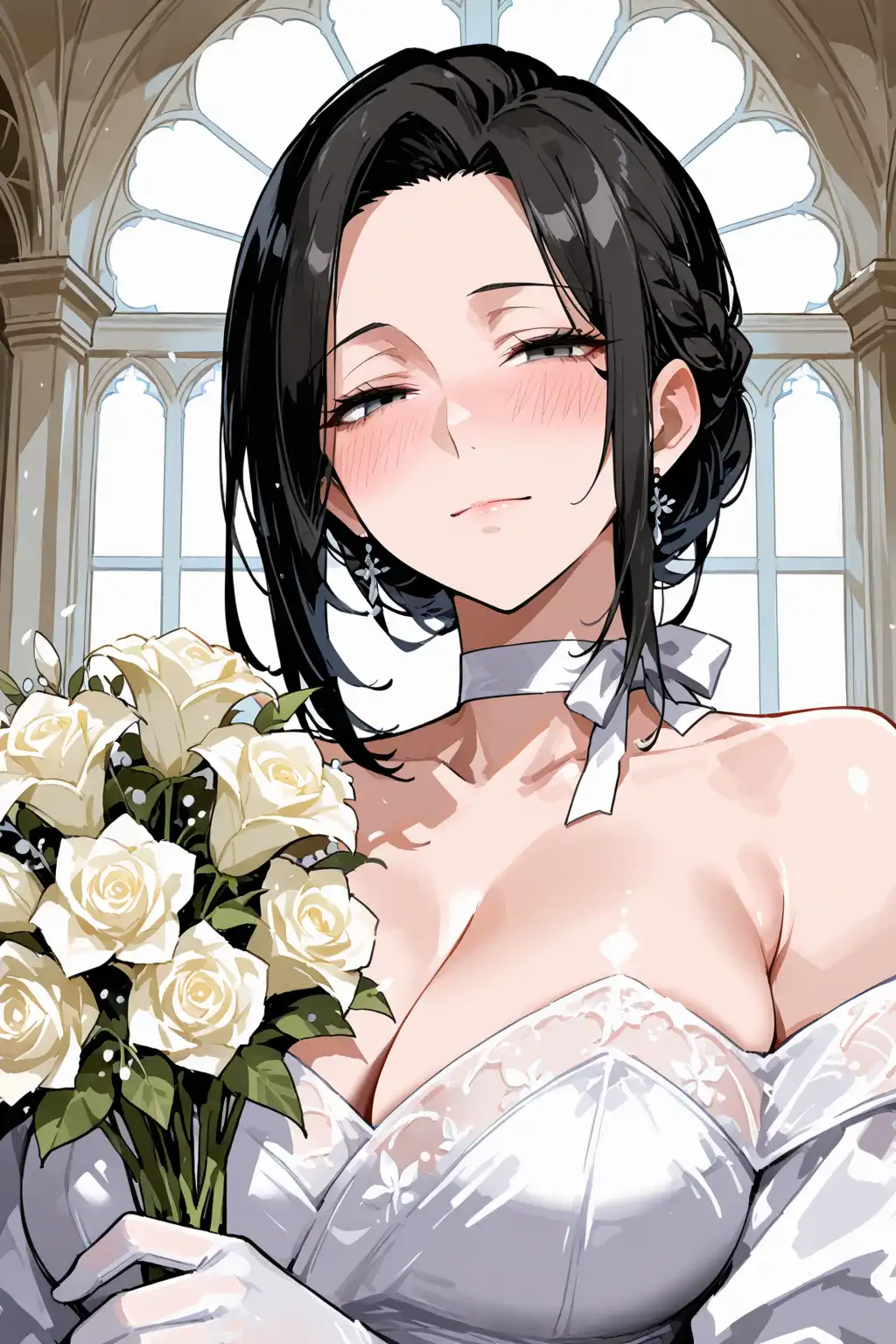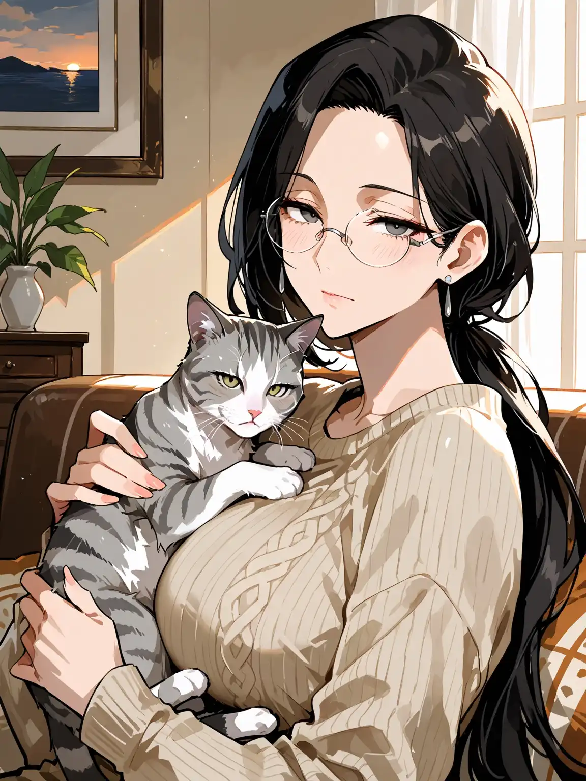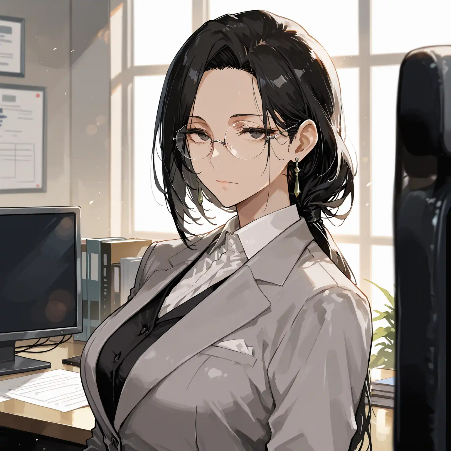 黑色長直髮,低馬尾,黑色瞳孔,細金邊眼鏡,剪裁俐落灰色西裝、窄裙。