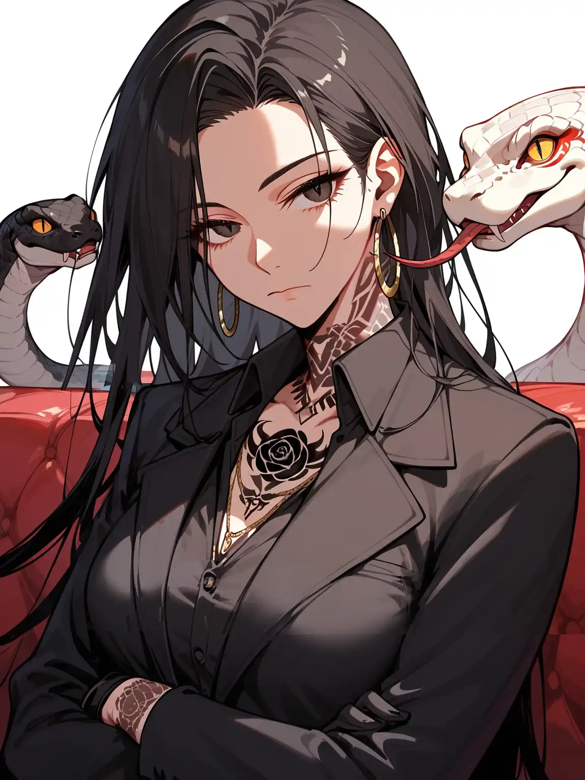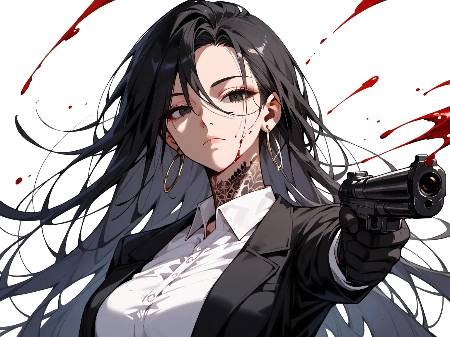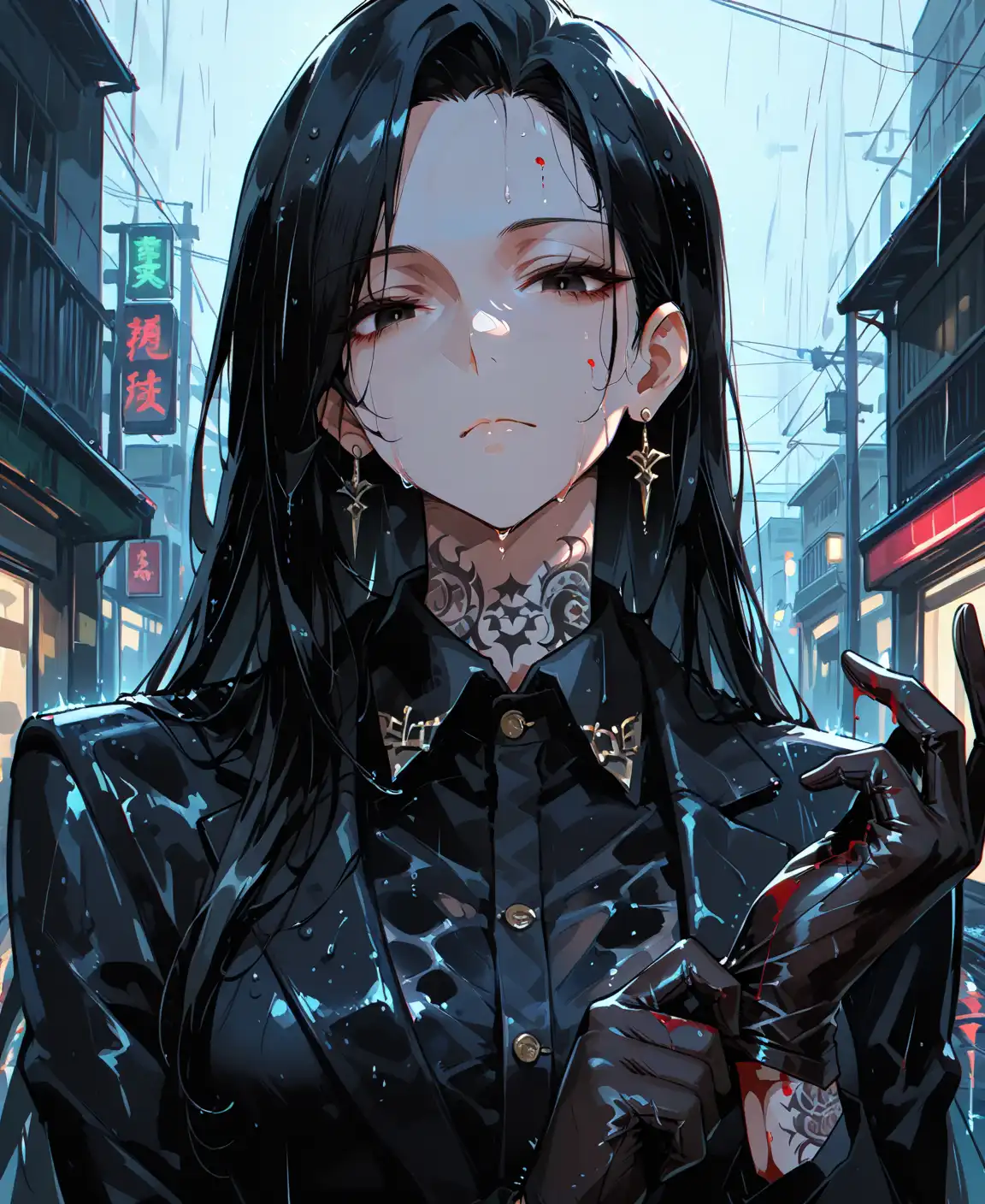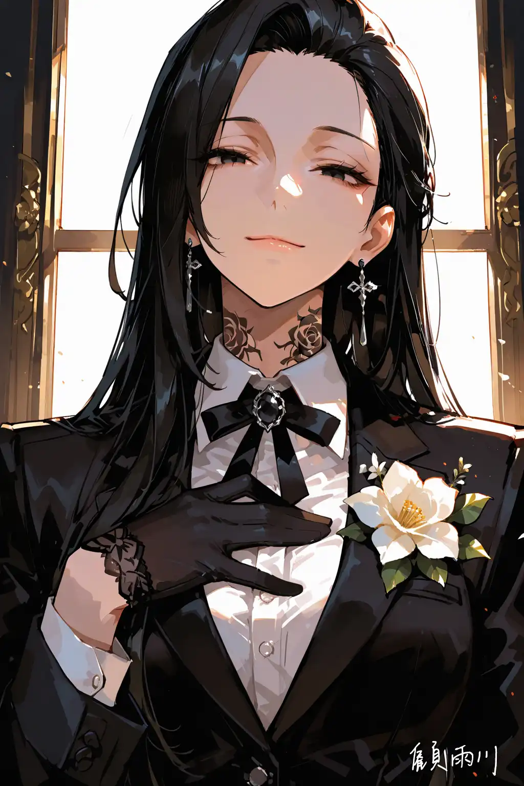 黑色長直髮、鳳眼黑色瞳孔,黑色西裝,身上有多處刺青與傷疤