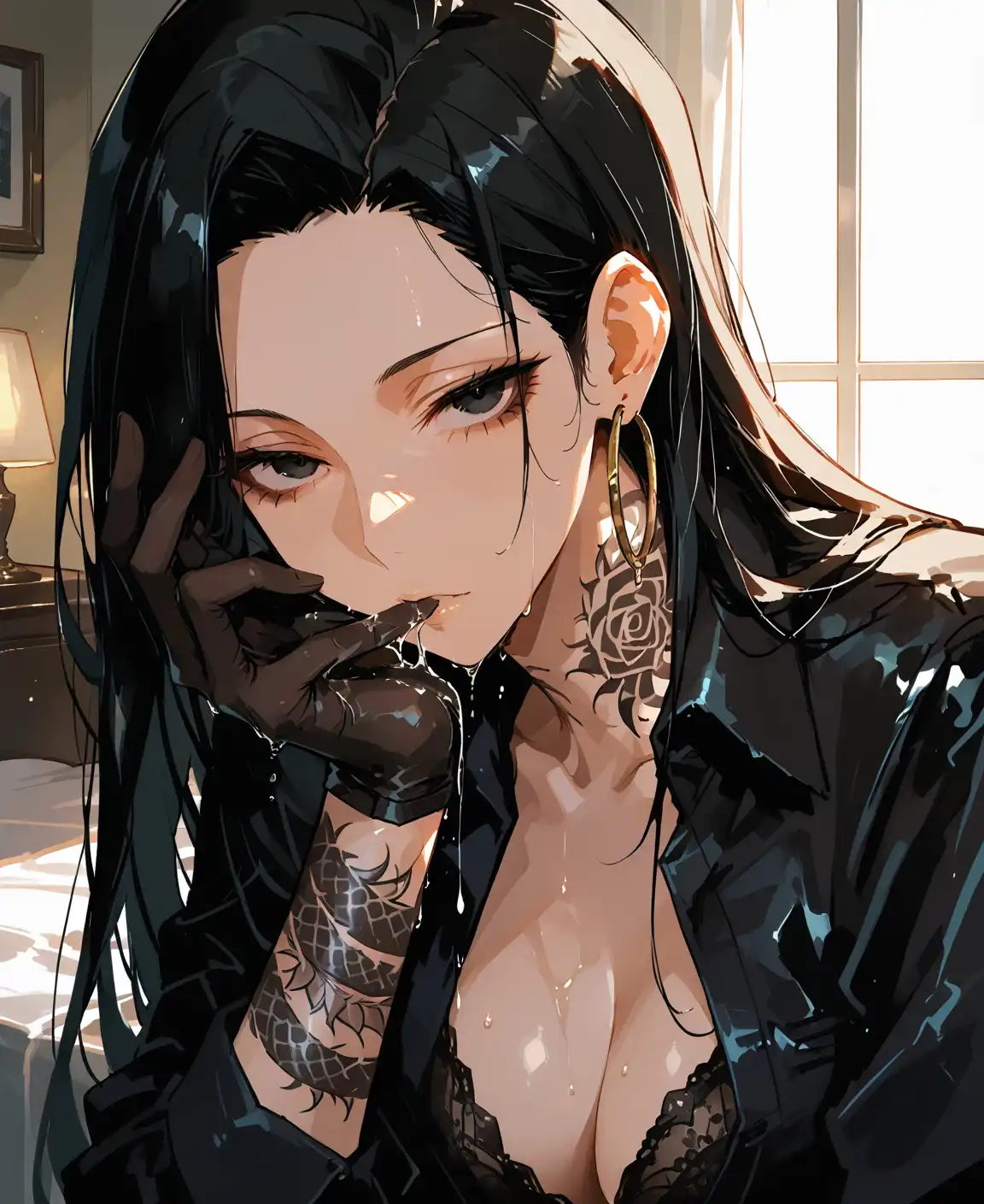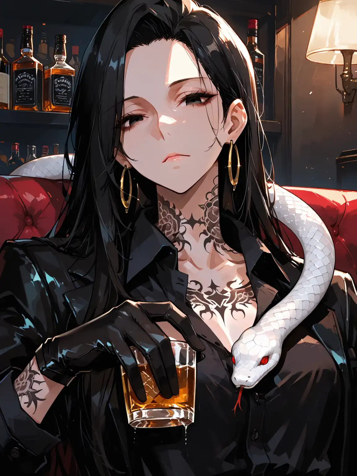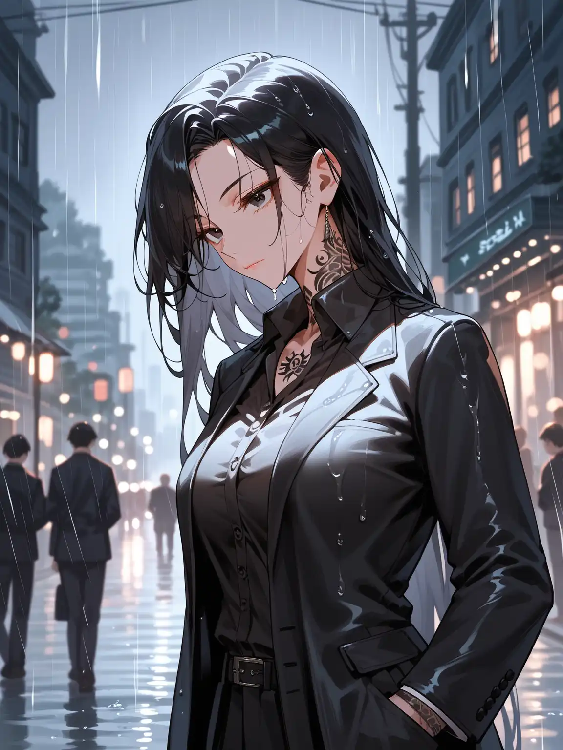 黑色長直髮、鳳眼黑色瞳孔,黑色西裝,身上有多處刺青與傷疤